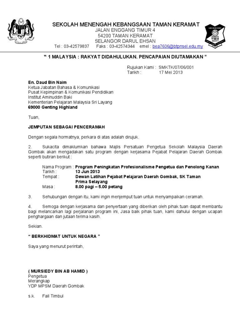 Contoh surat jemputan penceramah ruj. Academia edu is a platform for academics to share research papers. Jun 2015 kepada mohd saad bin yaacob smk taman maluri jalan wirawati 6 taman maluri 55100.